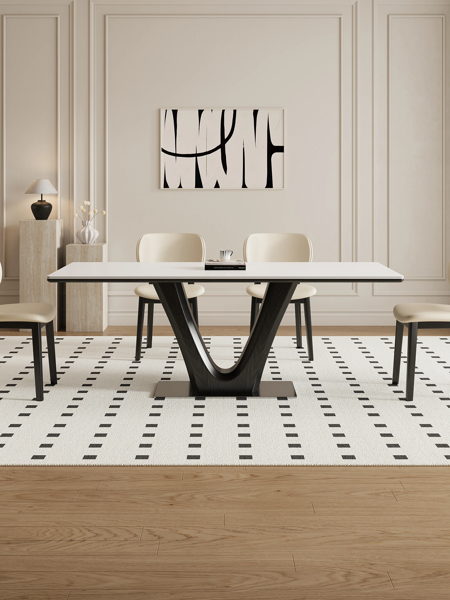 デリフォンの岩板ダイニングテーブル - 小型住宅に最適!クリーム色のレトロデザイン、洗練されたブラック仕上げ。全てを支えるデザイナーズテーブルで、スタイリッシュな食事空間を演出します。