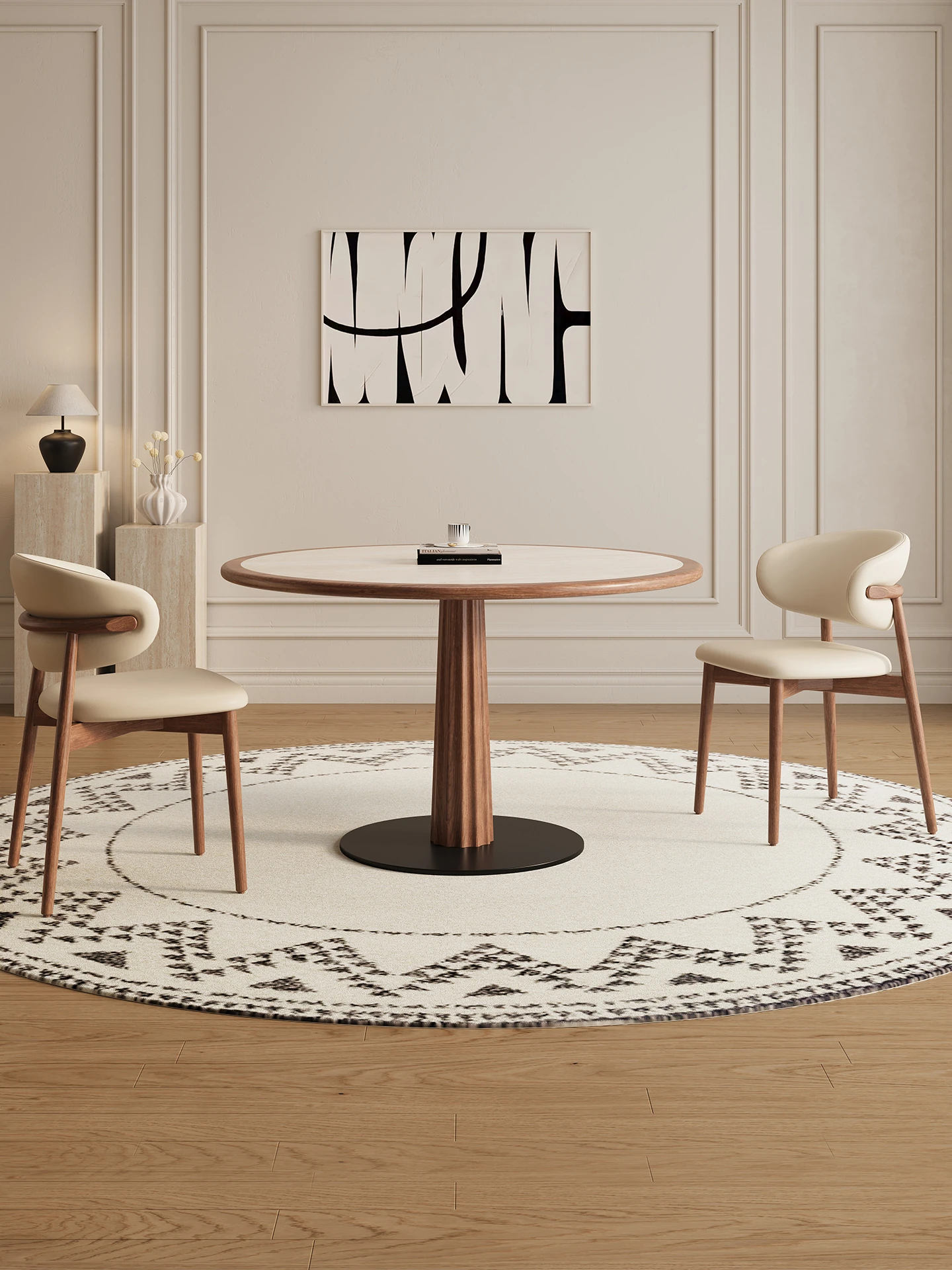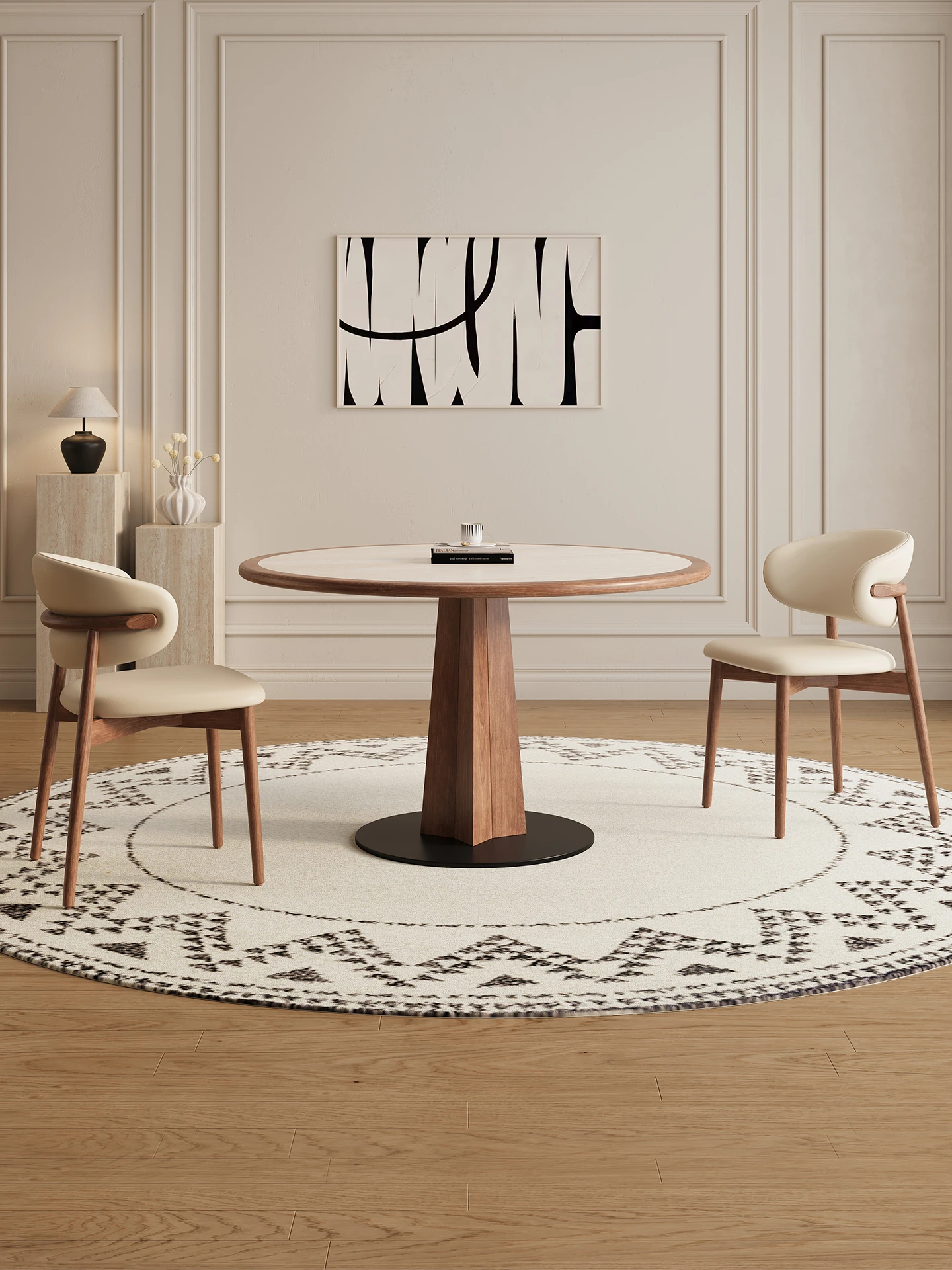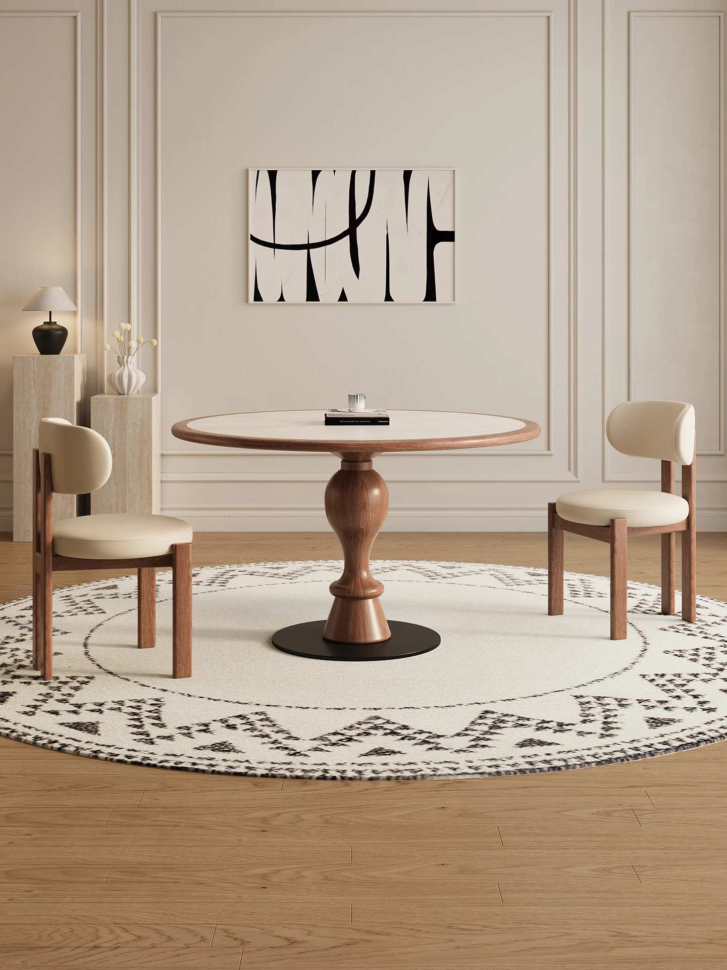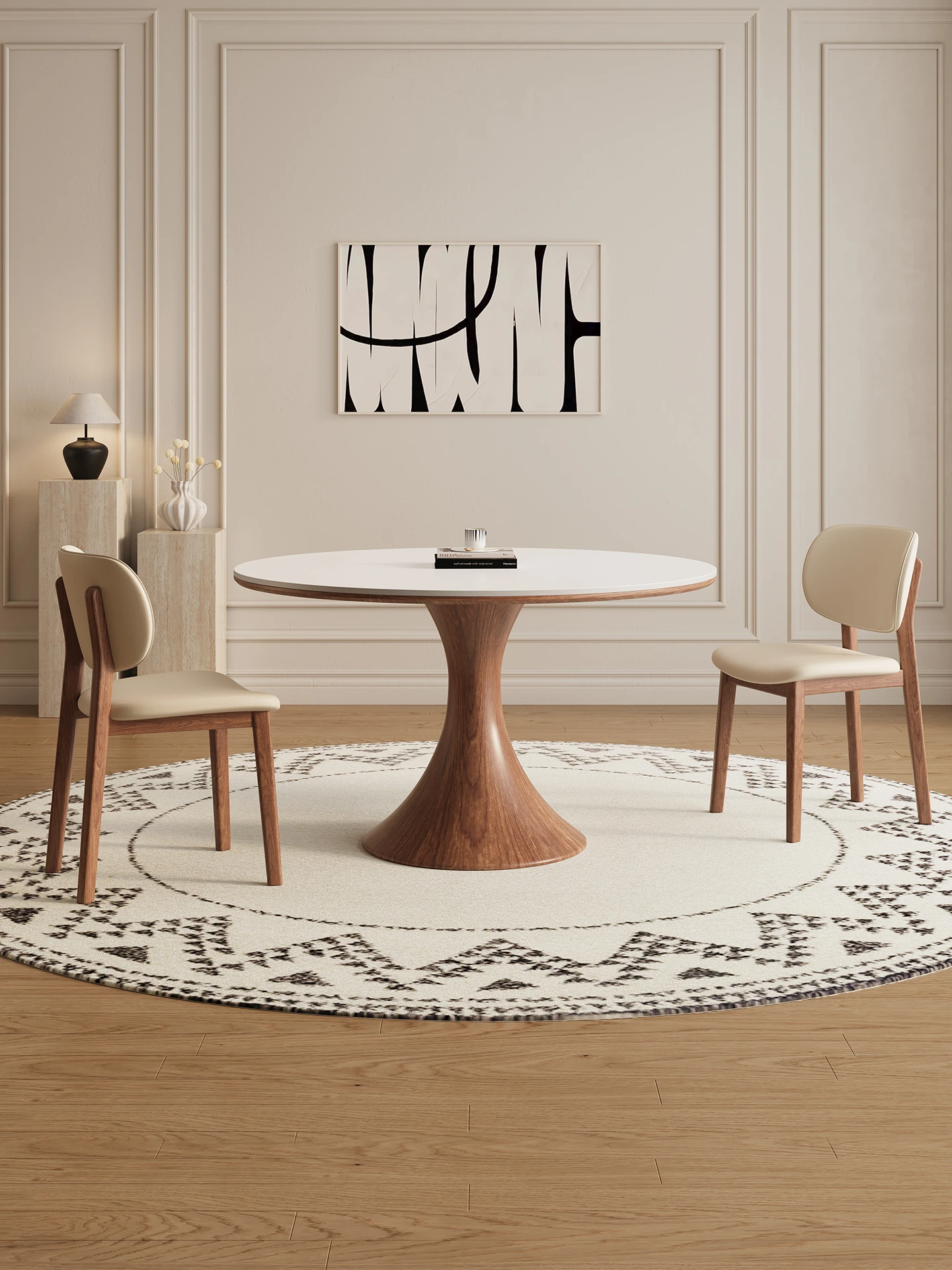 デリフォンの岩板ダイニングテーブル - 天然木の色合いのフレンチクリーム風シックなラウンドデザイン、家庭用全托式食卓。優雅な雰囲気で、特別な食事を演出します!