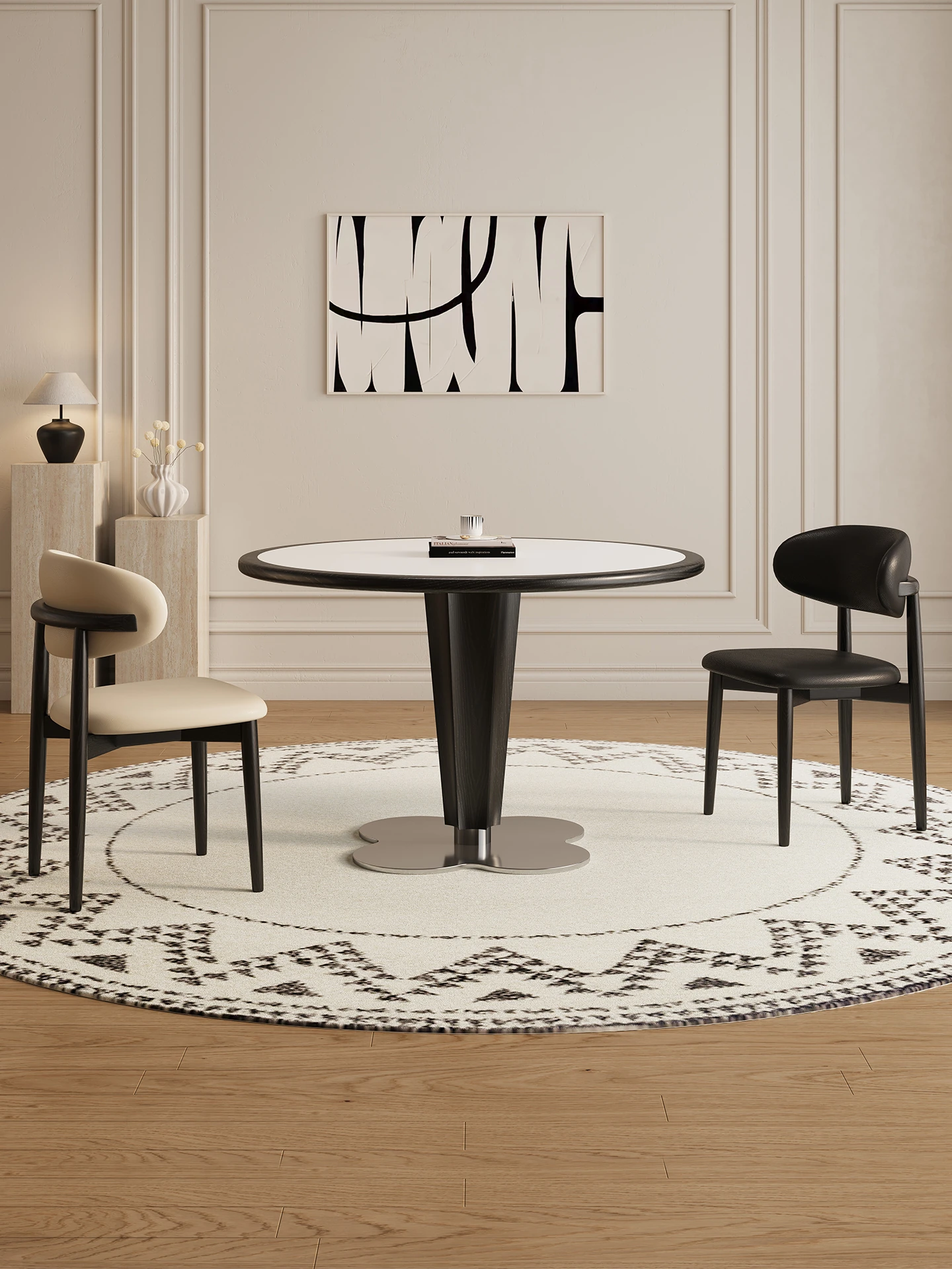 デリフォン無垢材ロックプレートダイニングテーブル - 黒色インセット、コンパクトサイズ、フレンチクリームスタイルのヴィンテージ感あふれる高級フルサポート円形テーブル。おしゃれな空間を演出します!