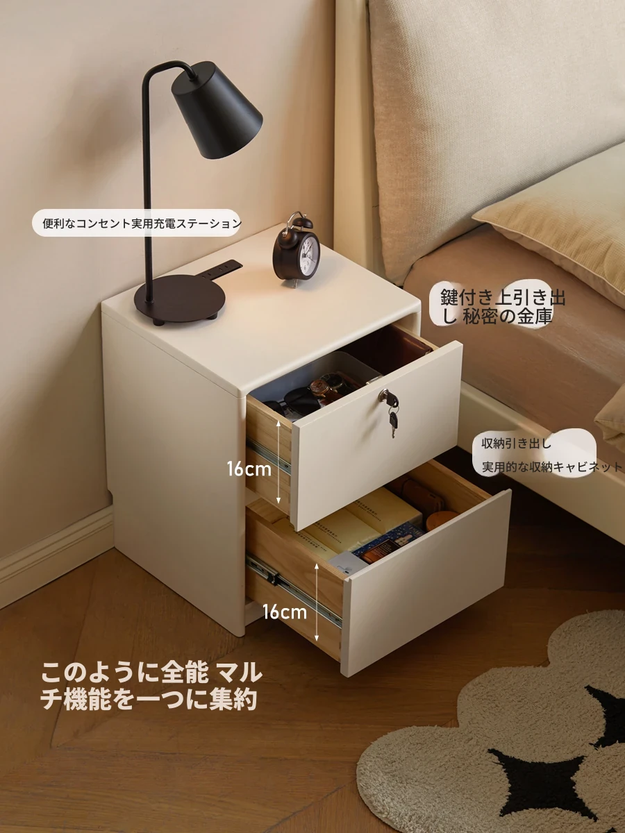 源氏木语の無垢材ワイドベッドサイドテーブル - ロック付き収納キャビネット、オーク材使用、便利なコンセント付き、ホワイト仕上げでお部屋をスタイリッシュに演出!