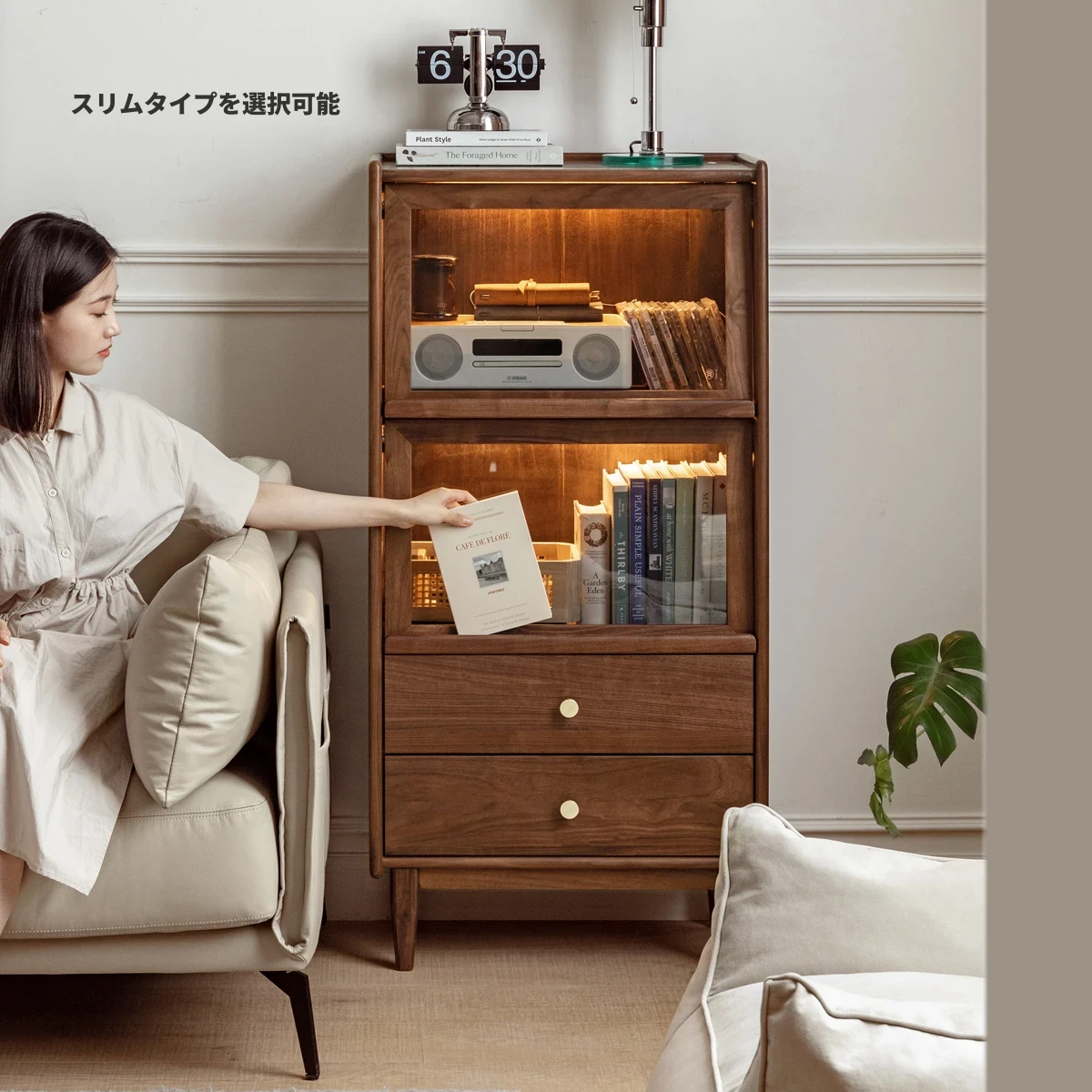 源氏木語の本物の木製書棚 - ガラス扉付きのスタイリッシュな本棚、フィギュア展示にも最適!シンプルで機能的な収納キャビネットで、無垢材の温もりを感じる空間を演出。あなたの本や宝物を美しく見せる収納です。