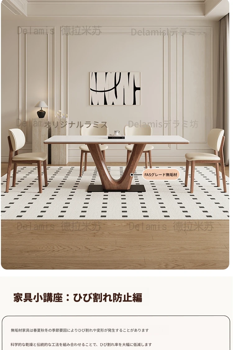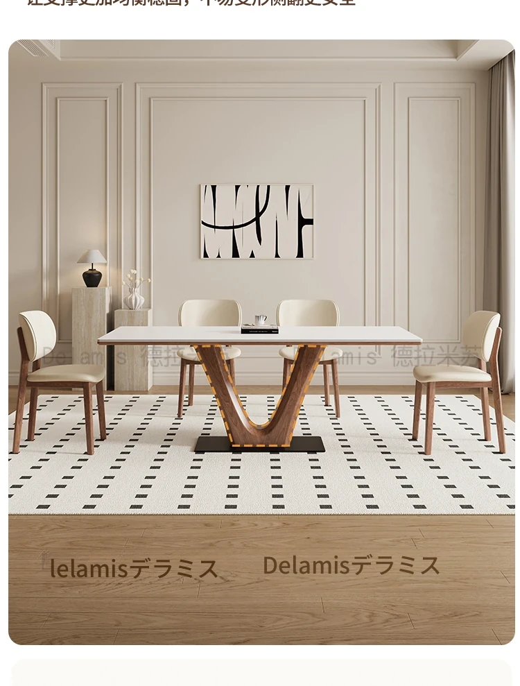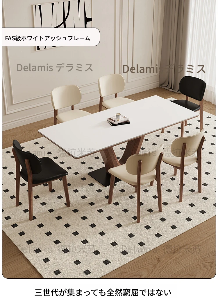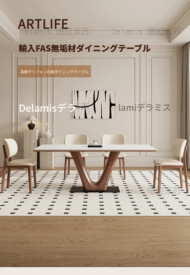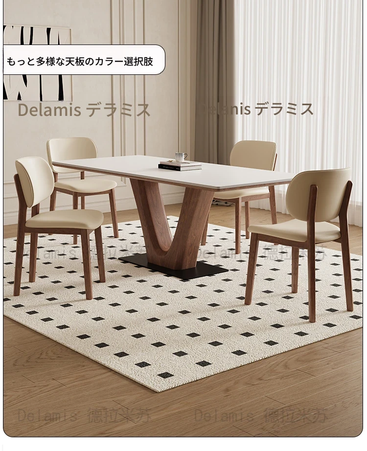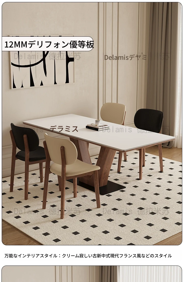 デリフォン無垢材ロックボードダイニングテーブル 家庭用ウォールナット色 フレンチクリーム風 中古デザインの長方形食卓 - 高級感溢れるデザインで、おしゃれな食卓を演出!
