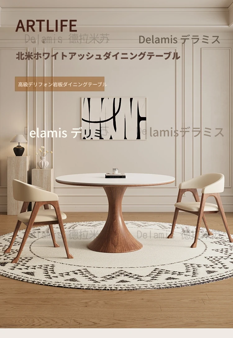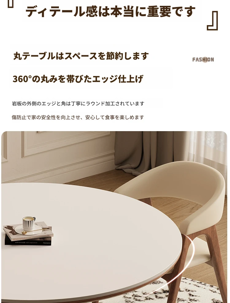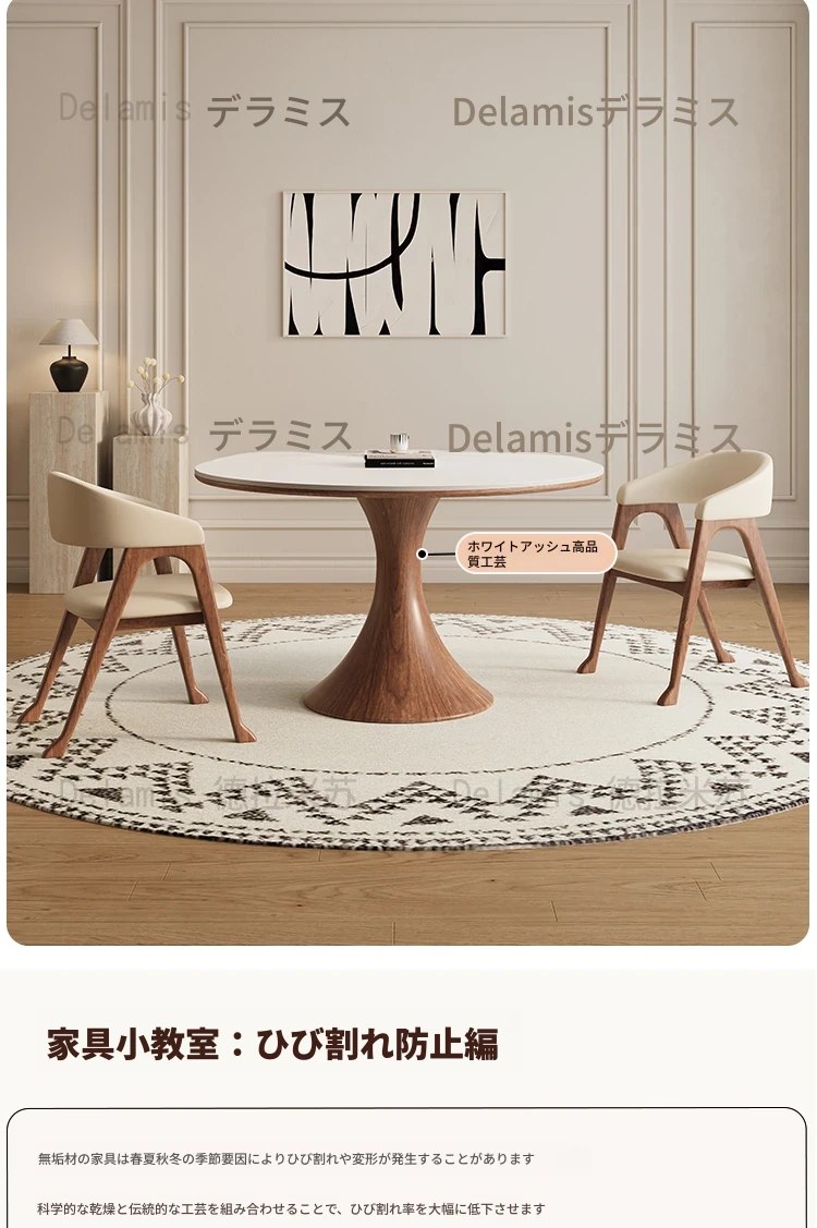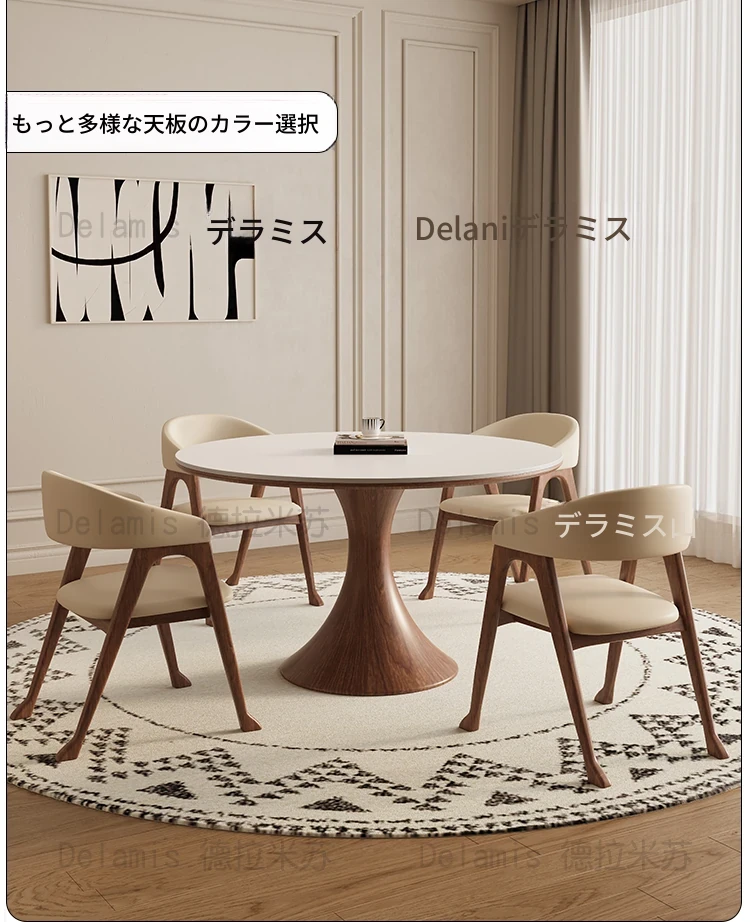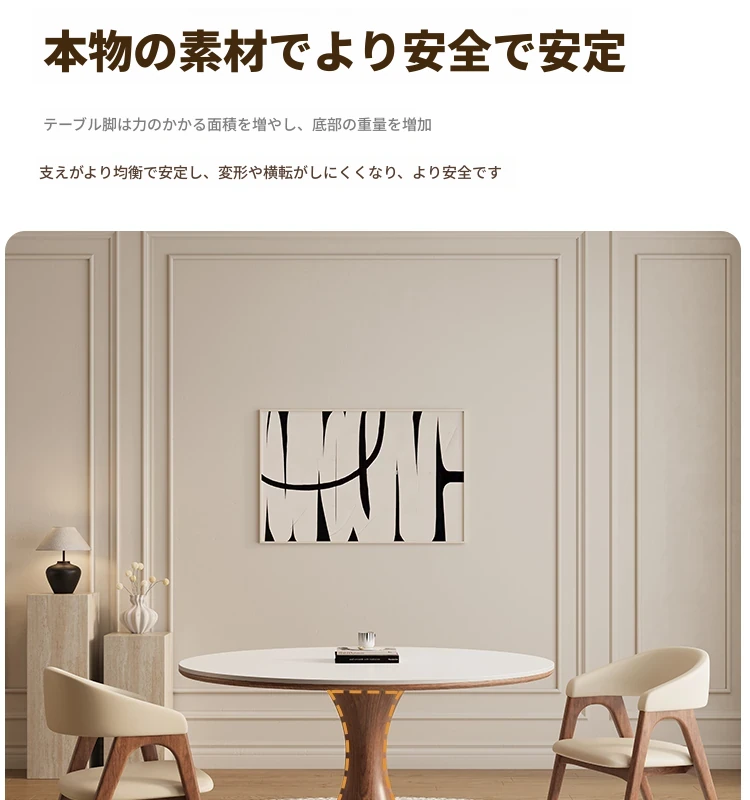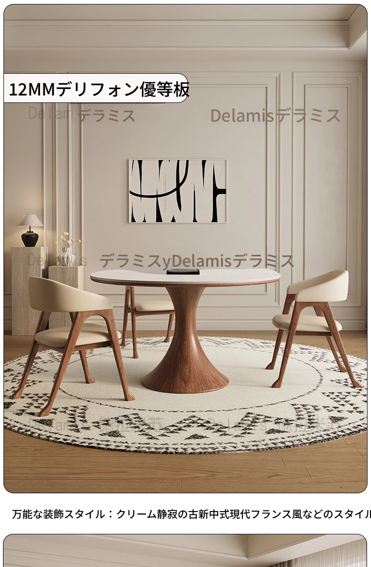 デリフォン無垢材の岩板ダイニングテーブル - 高級フレンチクリームスタイルのミニマルデザイン、狭いスペースにも最適な全支え型ラウンドテーブル。おしゃれでエレガントな食卓を演出します!