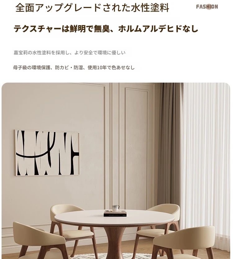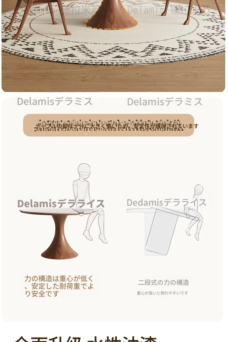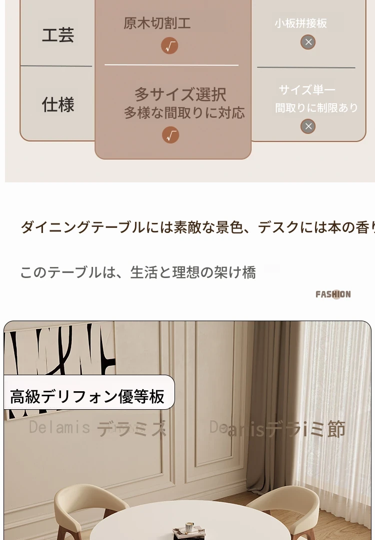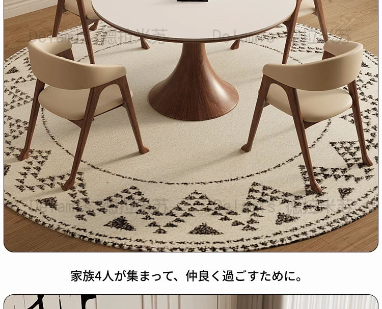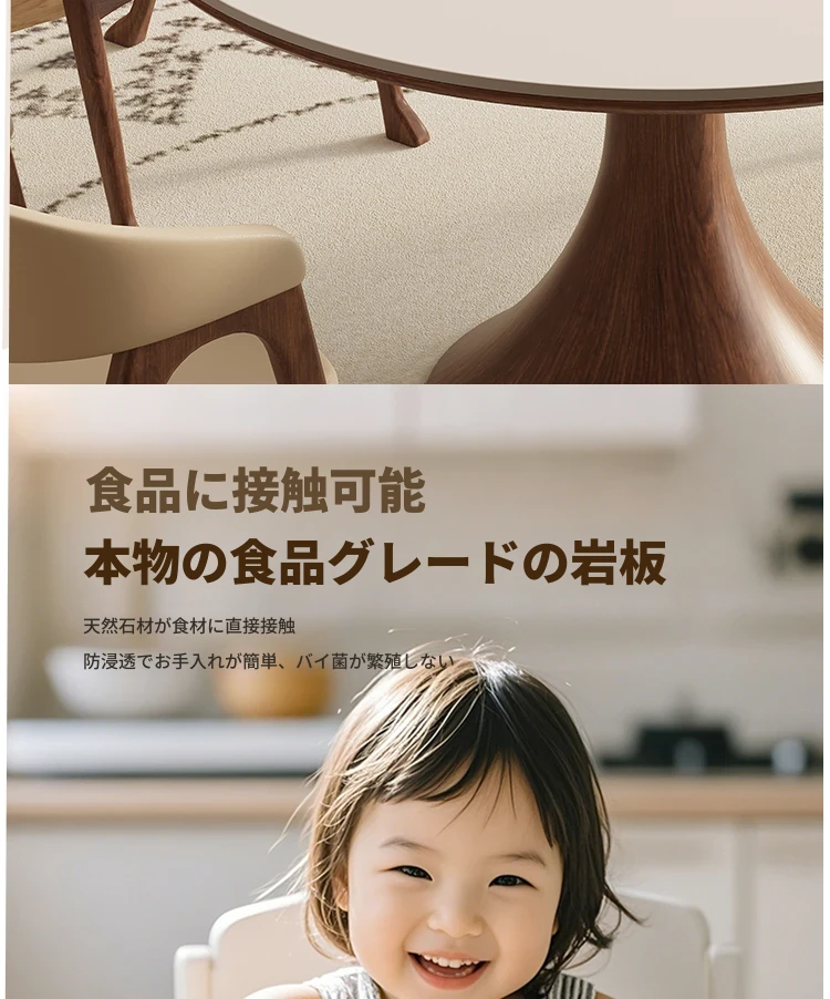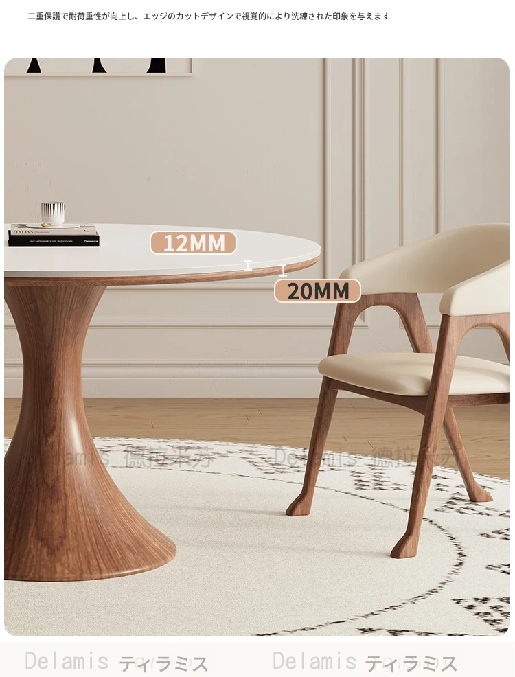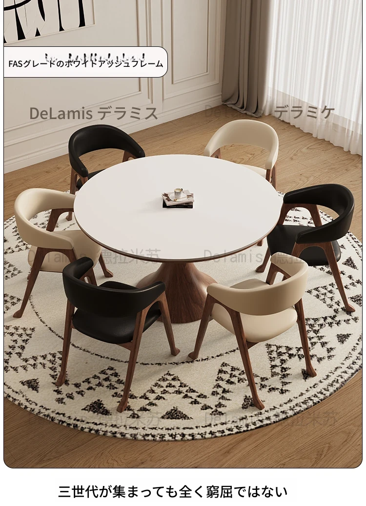 デリフォン無垢材の岩板ダイニングテーブル - 高級フレンチクリームスタイルのミニマルデザイン、狭いスペースにも最適な全支え型ラウンドテーブル。おしゃれでエレガントな食卓を演出します!