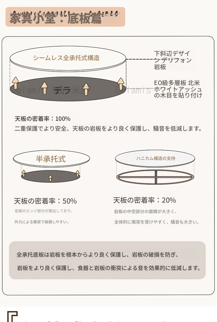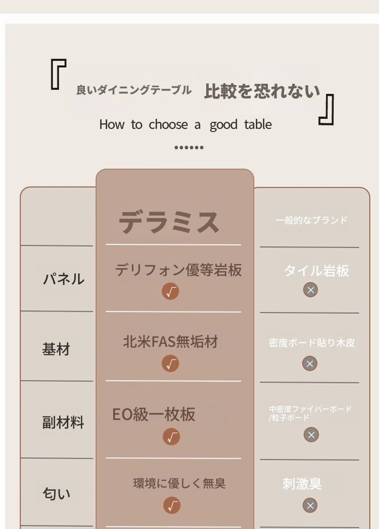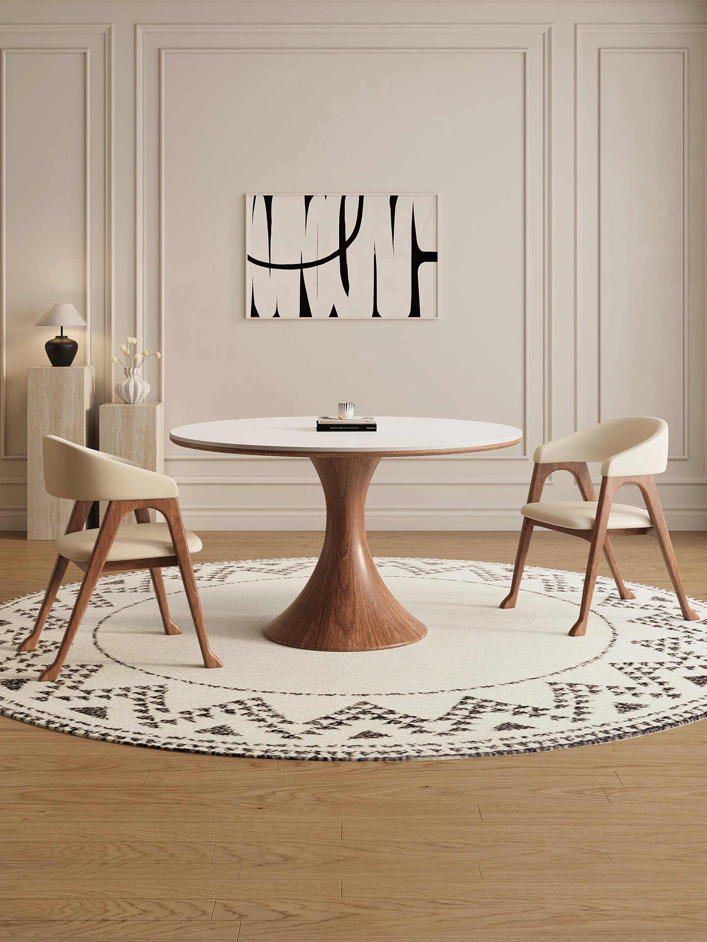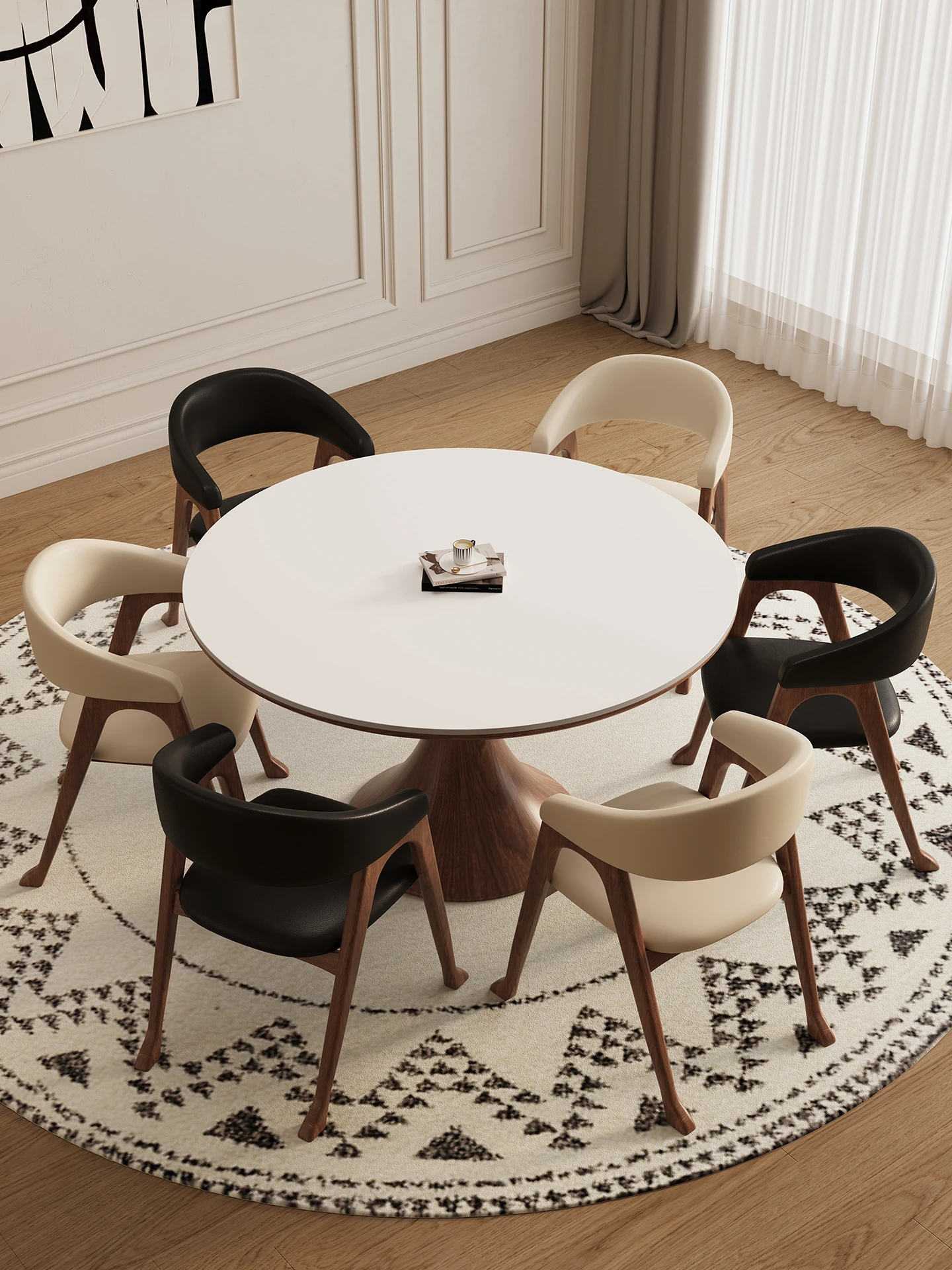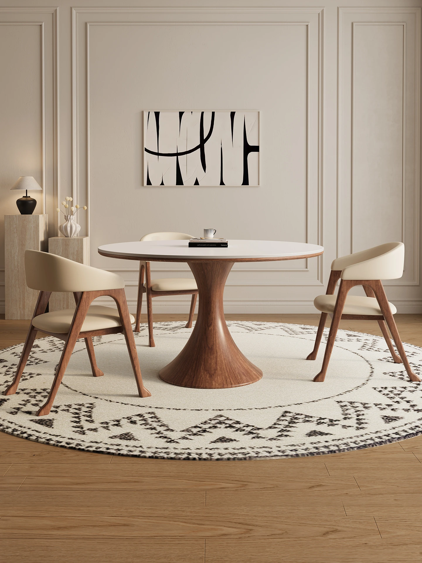 デリフォン無垢材の岩板ダイニングテーブル - 高級フレンチクリームスタイルのミニマルデザイン、狭いスペースにも最適な全支え型ラウンドテーブル。おしゃれでエレガントな食卓を演出します!