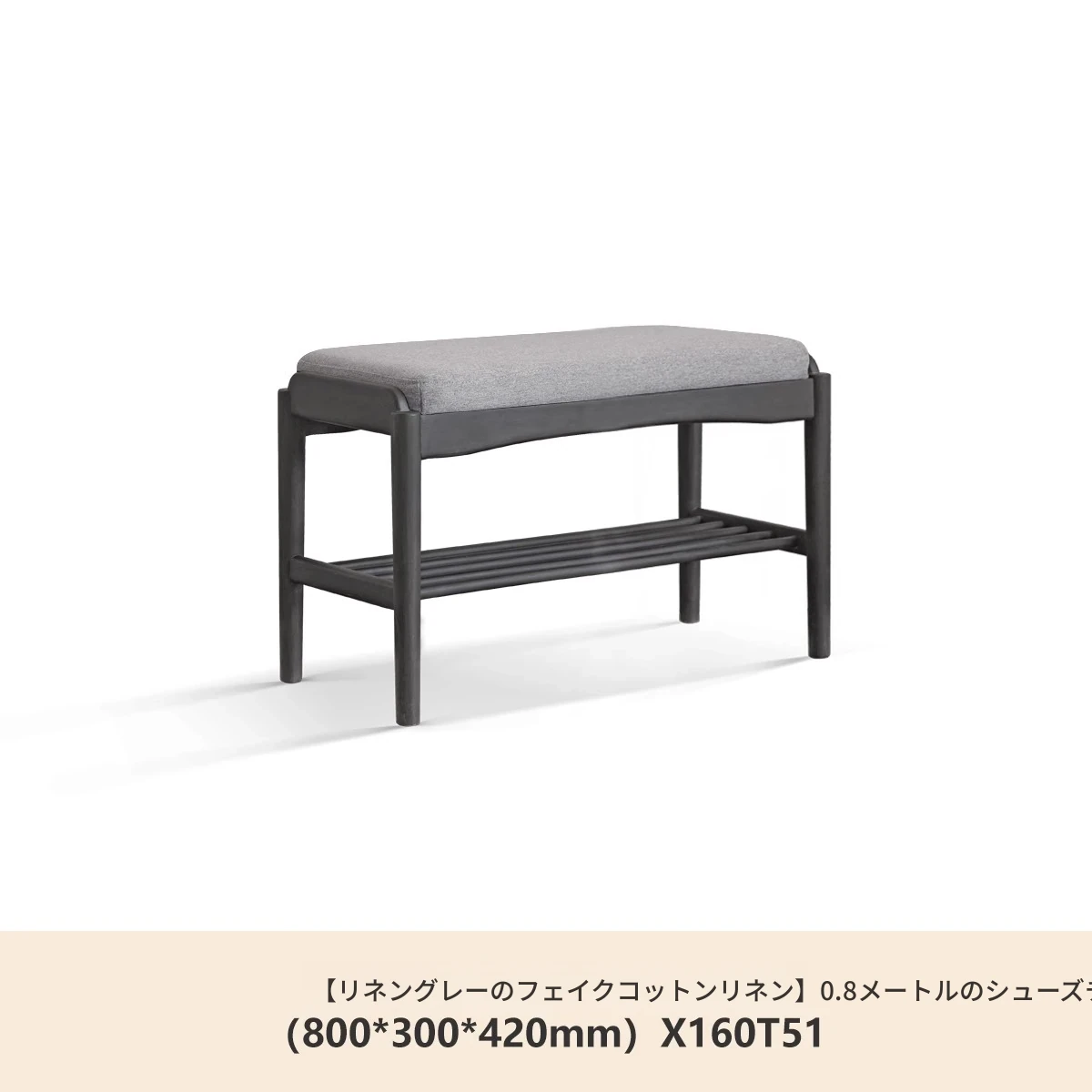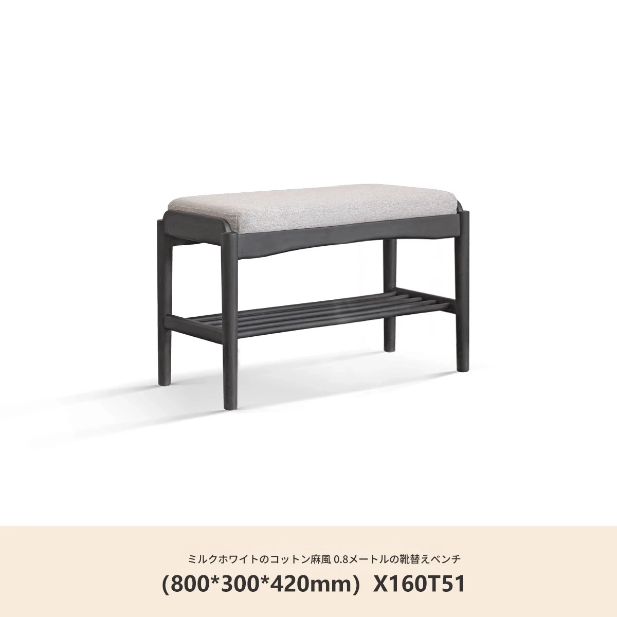 (ラバーウッドスモークカラー)0.8メートルシューズベンチ(コットンリネン風クリームホワイト)(800*300*420mm)