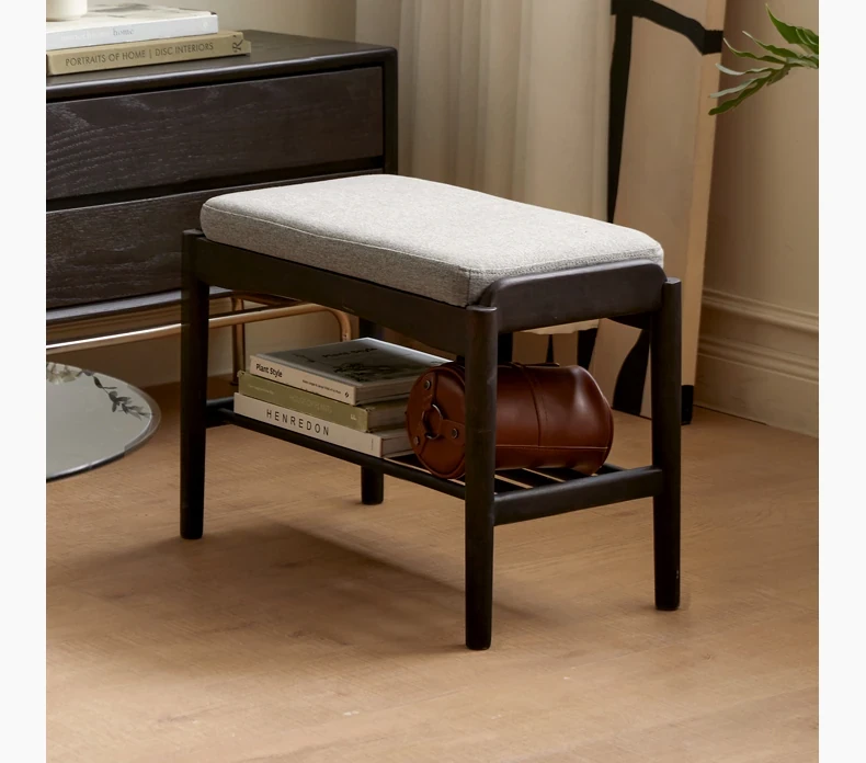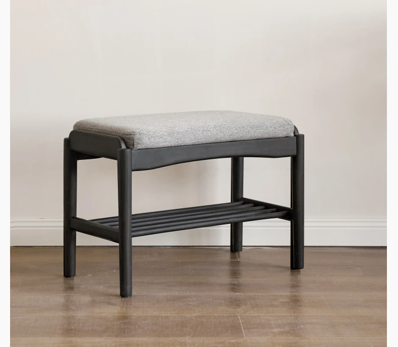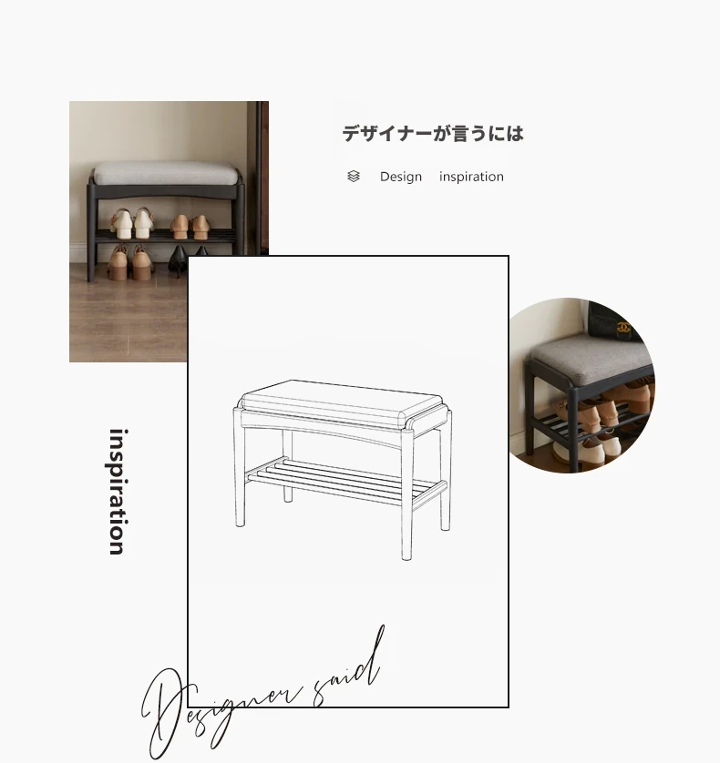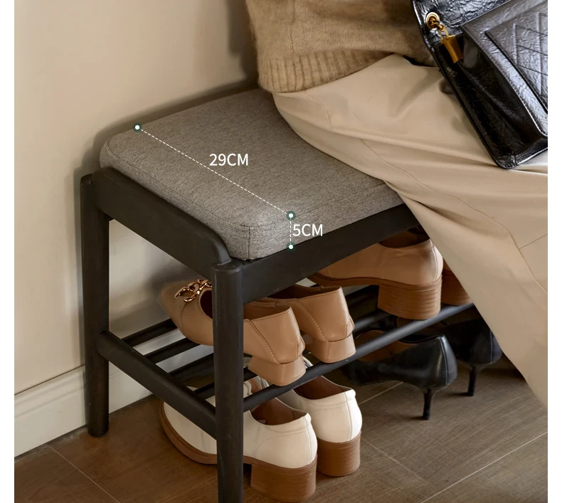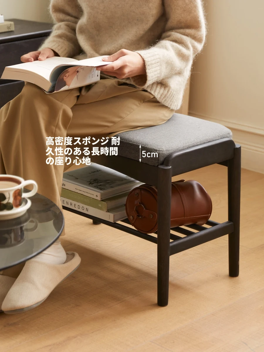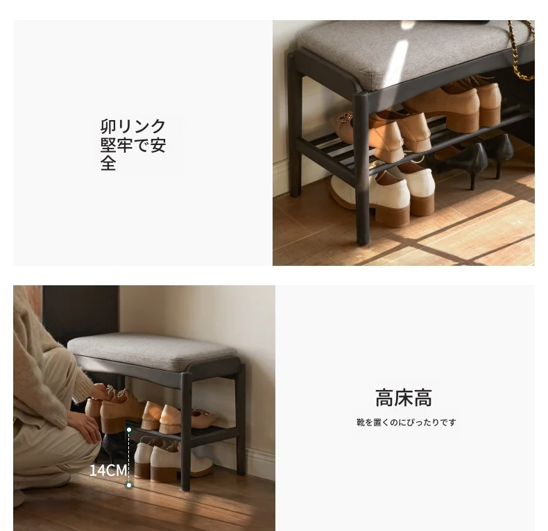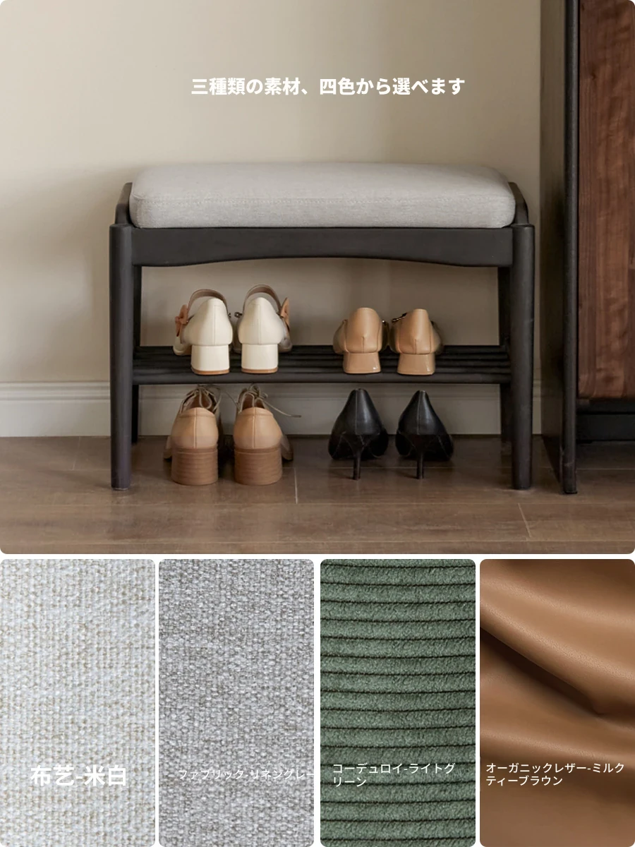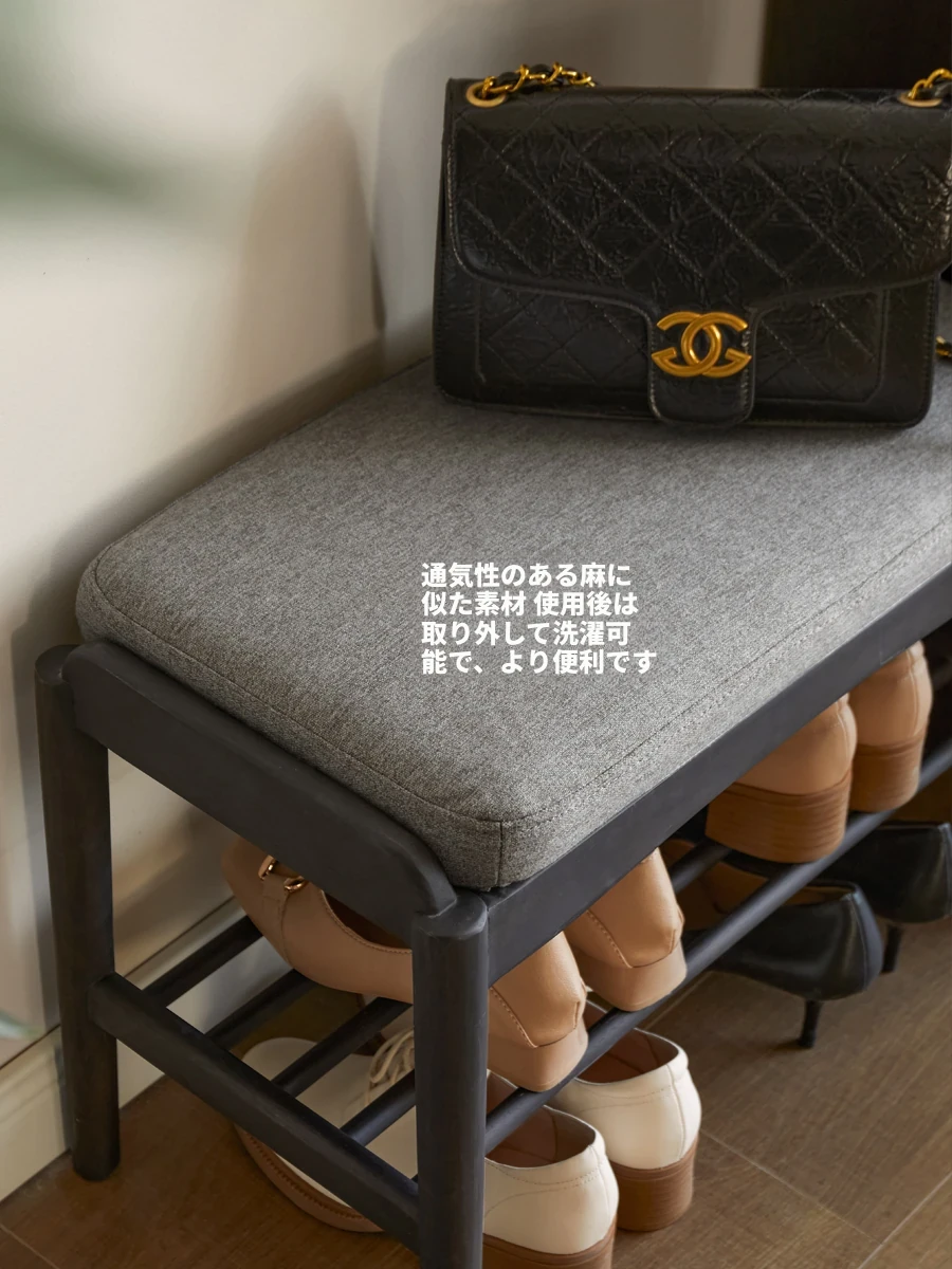 源氏木語の天然木製シューズベンチ - おしゃれな玄関マット付きで、靴を履く楽しさが倍増!黒色のソフトパッドで快適さ抜群、家庭用に最適な収納シューズキャビネット兼用のスツールです。