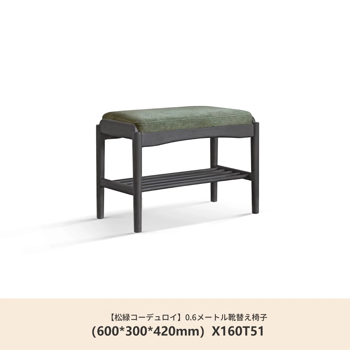 (ラバーウッドスモークカラー)0.6メートルシューズベンチ(コーデュロイライトグリーン)(600*300*420mm)