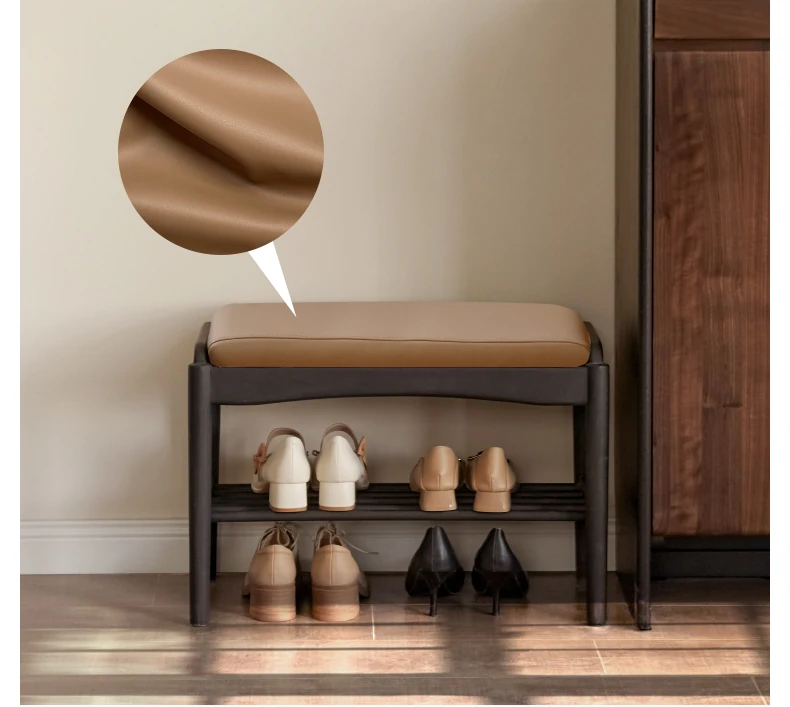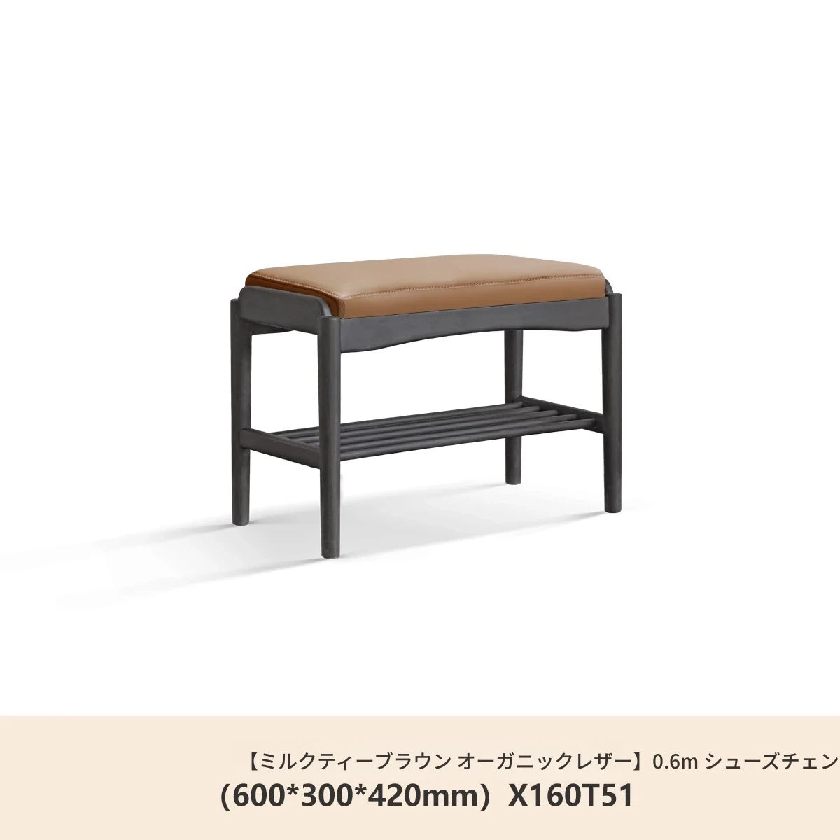 (ラバーウッドスモークカラー)0.6メートルシューズベンチ(オーガニックレザーミルクティーブラウン)(600*300*420mm)