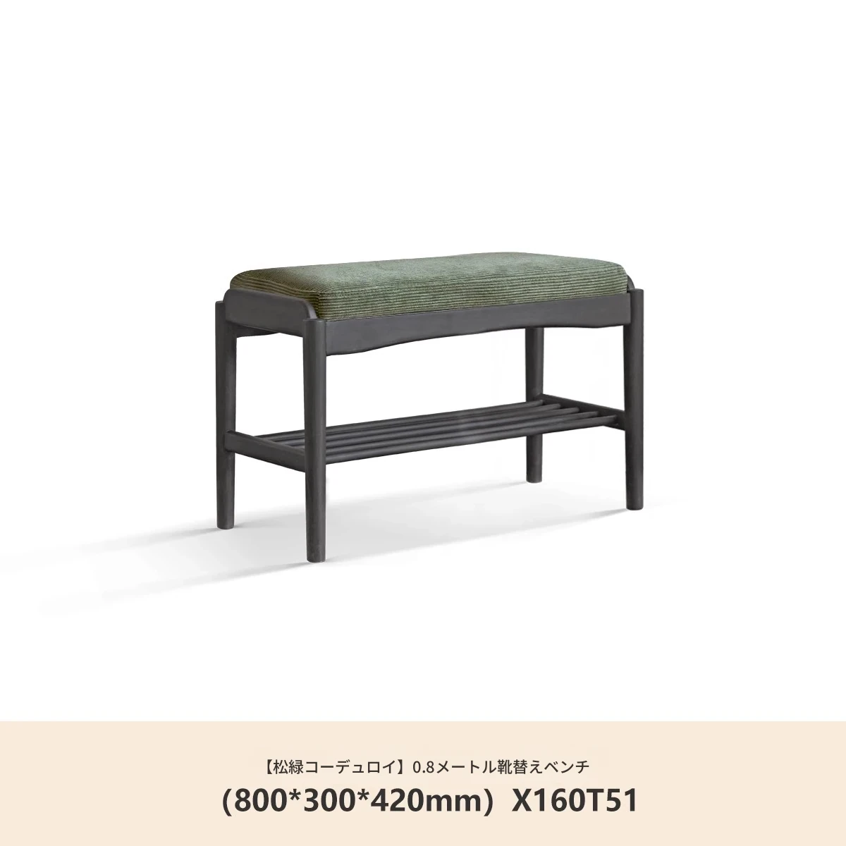 (ラバーウッドスモークカラー)0.8メートルシューズベンチ(コーデュロイライトグリーン)(800*300*420mm)