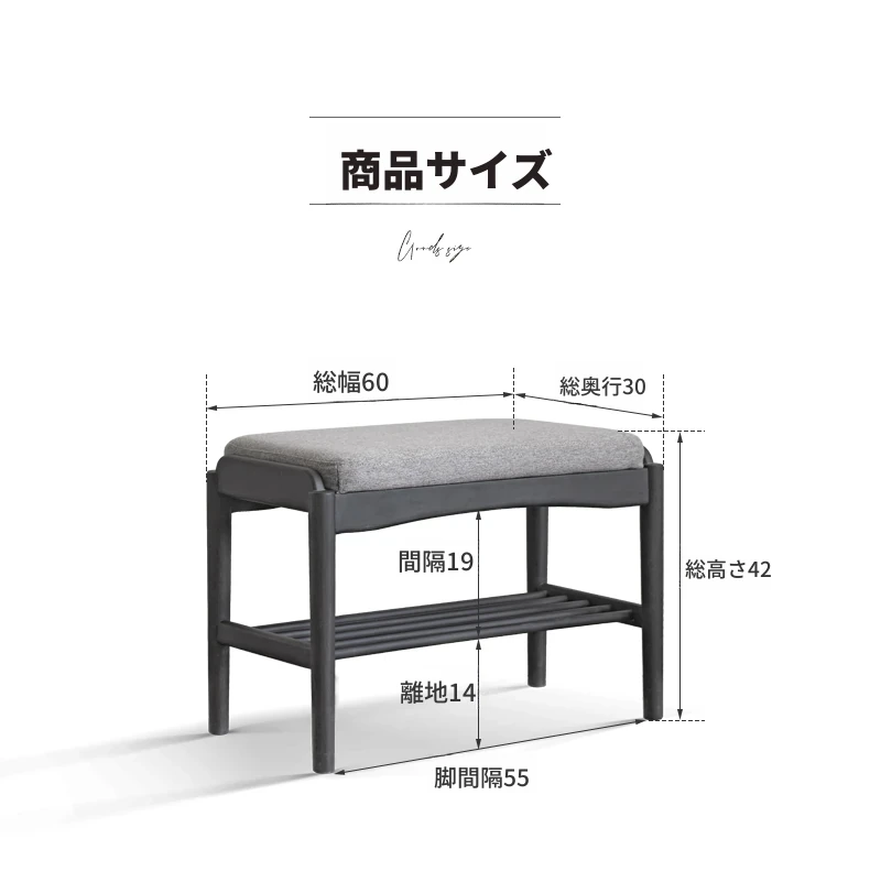 (ラバーウッドスモークカラー)0.6メートルシューズベンチ(コットンリネン風リネーグレー)(600*300*420mm)