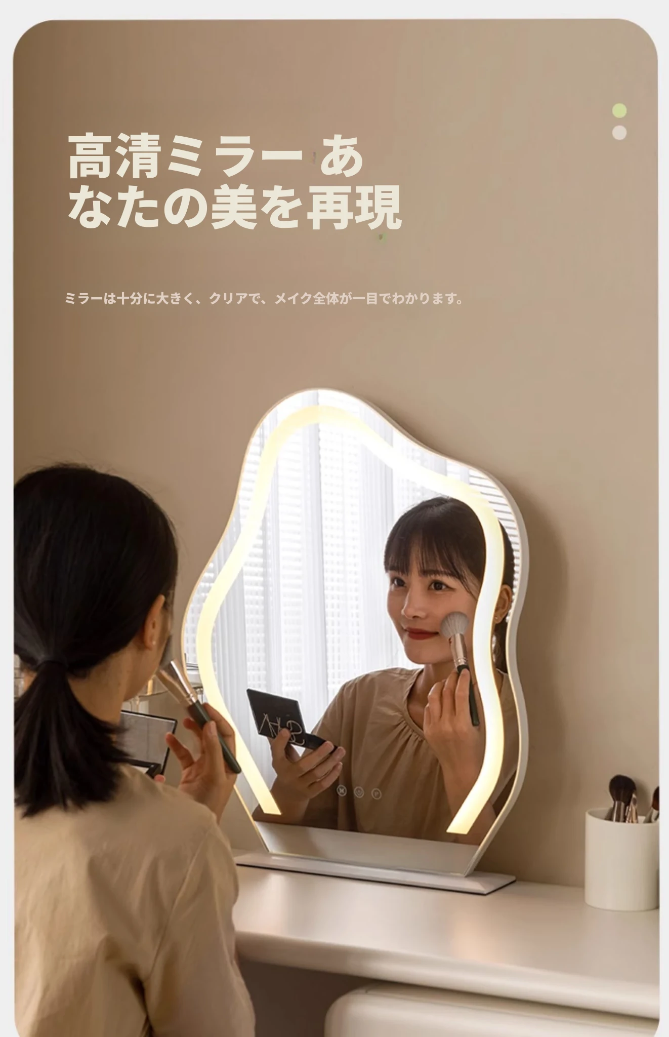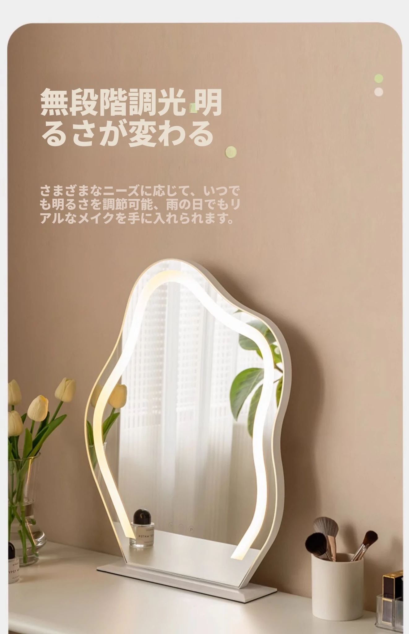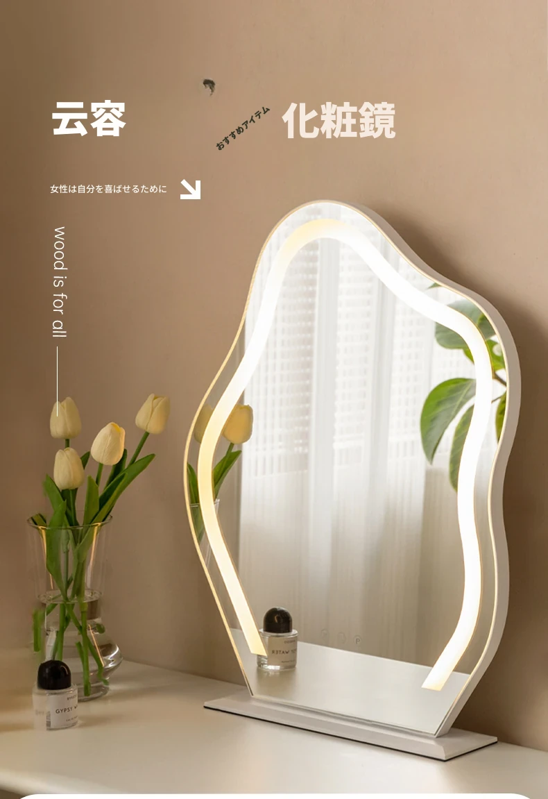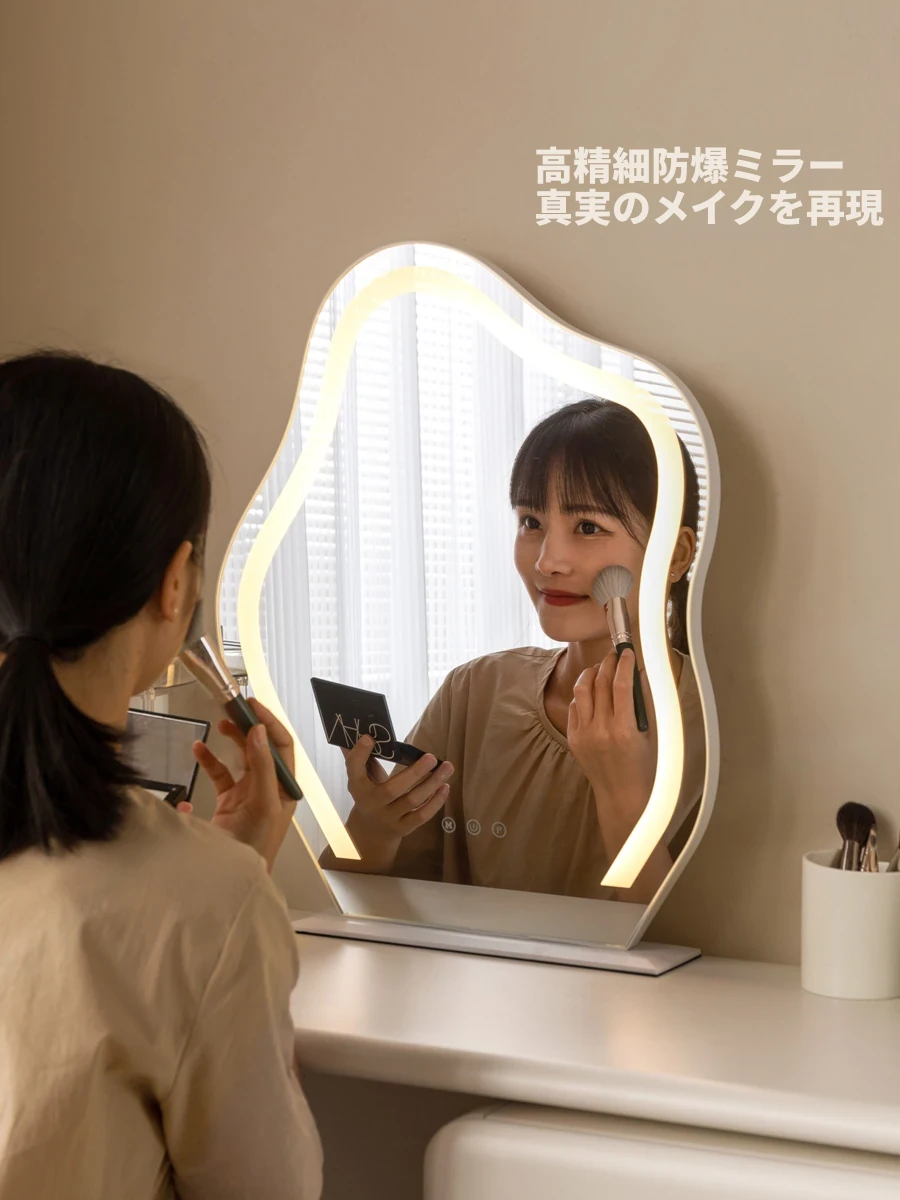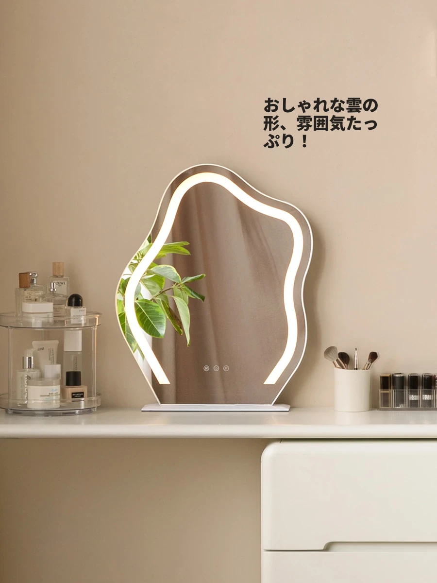 源氏木语の軽奢雲朵化粧鏡 - おしゃれな寝室にぴったり!クリーミーな風合いのシンプルデザイン、LED補光機能付きでメイクがもっと楽しくなる!防爆設計も安心。あなたのビューティータイムを彩ります。
