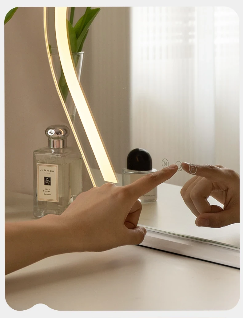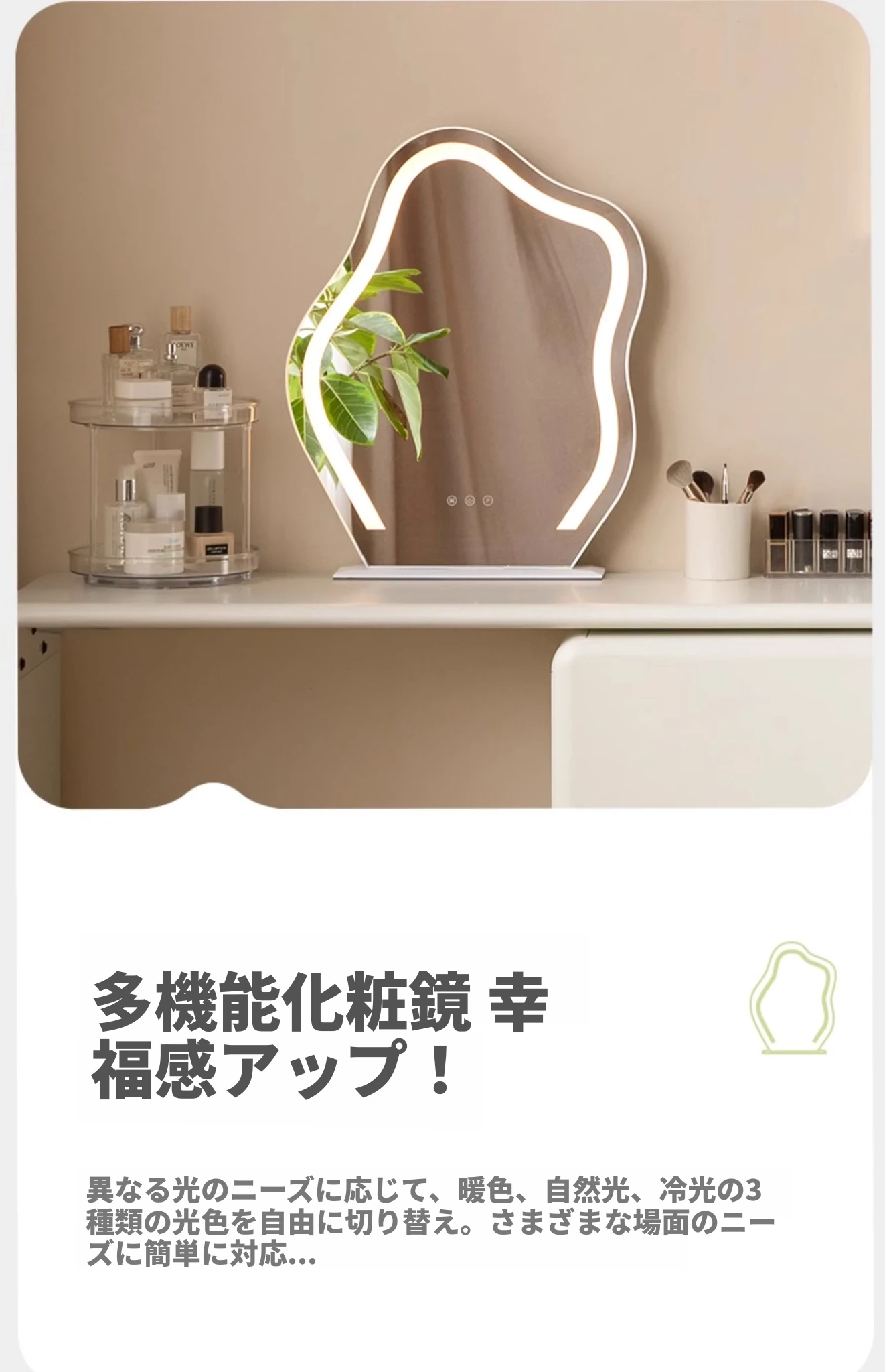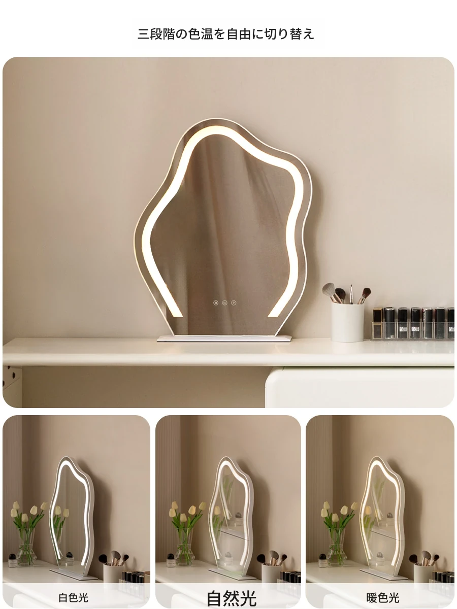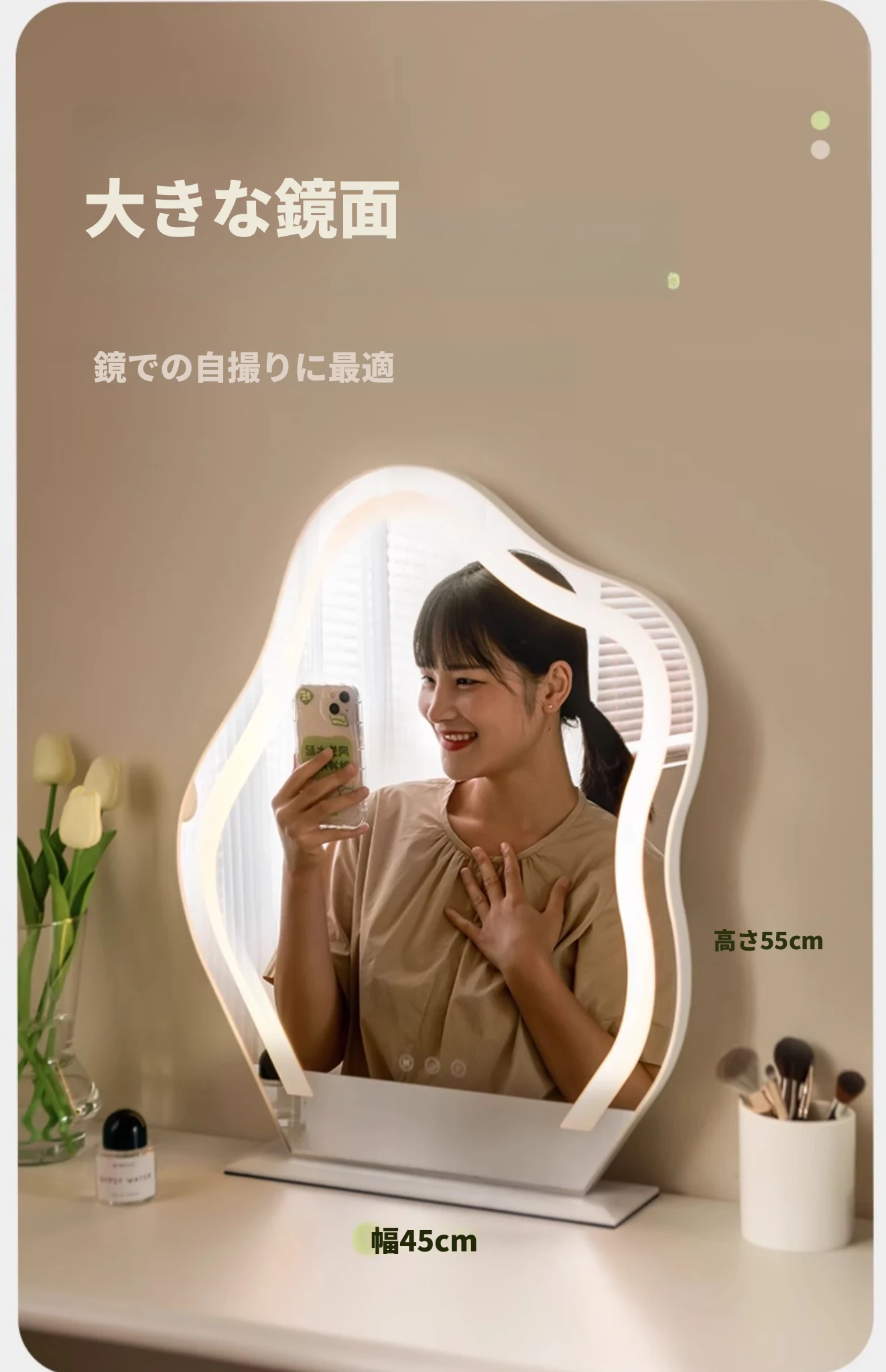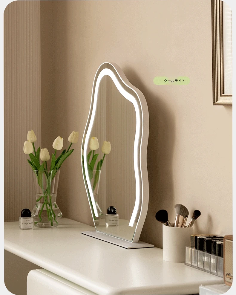 源氏木语の軽奢雲朵化粧鏡 - おしゃれな寝室にぴったり!クリーミーな風合いのシンプルデザイン、LED補光機能付きでメイクがもっと楽しくなる!防爆設計も安心。あなたのビューティータイムを彩ります。
